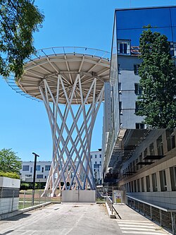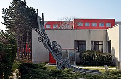 | ÖBB Lehrlingsheim, Kundratstraße, Wien-Meidling. Die Skulptur im Hintergrund ist folgendermaßen bezeichnet: Eisenbahn, Schiene, Zukunft Skulptur von A. Obermoser Hergestellt von den Lehrlingen der Lernwerkstätte Attnang-Puchheim. | Eigenes Werk | Herzi Pinki | Datei:Eisenbahn, Schiene, Zukunft by A. Obermoser, Kundratstraße.jpg | |