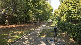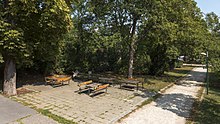 Gegenüber dem Unfallkrankenhaus erstreckt sich der Meidlinger Friedhof, dessen neuerer Teil hier einen Eingang hat.