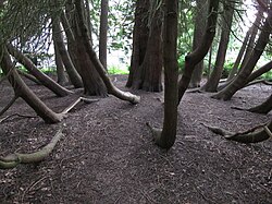 Nadelbäume: Schierlingstannen (Tsuga sp.), Echte Sumpfzypresse (Taxodium distichum), Abendländischer Lebensbaum (Thuja occidentalis), Morgenländischer Lebensbaum (Thuja orientalis), Riesen-Lebensbaum (Thuja plicata), Lawsons Scheinzypresse (Chamaecyparis lawsoniana), Virginischer Wacholder (Juniperus virginiana), Beschuppter Wacholder „Meyeri“ (Juniperus squamata f. mayeri), Japanische Lärche (Larix kaempferi) und Douglasie (Pseudotsuga menziesii).