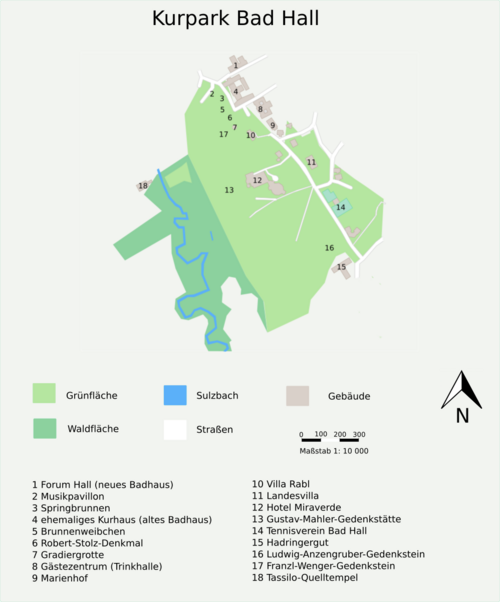 Lageplan des Kurpark Bad Hall | https://www.openstreetmap.org/#map=16/48.0306/14.2109 | Studentin96 with sources created by the OpenStreetMap Community and by User:Studentin96 | Datei:Lageplan Kurpark Bad Hall.png | |