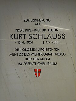 | Gedenktafel für Kurt Schlauss (Wien, Karlsplatz, U-Bahnpassage, Abgang bei der Secession) | Eigenes Werk | GuentherZ | Datei:Wien01 Karlplatz U-Bahn-Passage 2018-02-15 GuentherZ GD Schlauss 0598.jpg | |