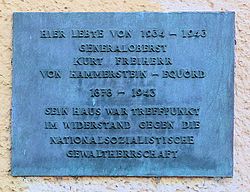 | Gedenktafel, Kurt Freiherr von Hammerstein-Equord , Breisacher Straße 19, Berlin-Dahlem , Deutschland | Selbst fotografiert | OTFW , Berlin | Datei:Gedenktafel Breisacher Str 19 (Dahl) Kurt Freiherr von Hammerstein-Equord.JPG | |