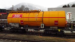 | Kesselwagen des im Bahnhof Bludenz stationierten Tunnellöschzugs | Eigenes Werk | 32-Fuß-Freak | Datei:Kesselwagen Tunnellöschzug Bludenz.jpg | |
