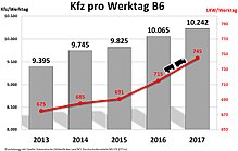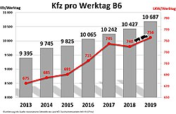 Das durchschnittliche tägliche Verkehrsaufkommen an einem Werktag erreichte im Jahr 1998 6848 Kfz/24 h, im Jahr 2021 bereits 10.171 Kfz/24h. Der Anteil an LKW beträgt circa 8 % und lag 2021 bei durchschnittlich 850 LKW pro Tag. Im Oktober 2021 wurden erstmals seit der Verkehrsaufzeichnung durchschnittlich über 1.000 LKW pro Tag erfasst.[8]