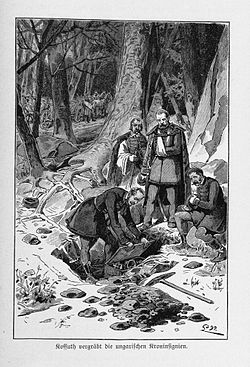| Image extracted from page 619 of Die deutsche Revolution. Geschichte der deutschen Bewegung von 1848 und 1849 ... Illustrirt, etc' , by BLOS, Wilhelm (1893). Original held and digitised by the British Library. Copied from Flickr . Note: The colours, contrast and appearance of these illustrations are unlikely to be true to life. They are derived from scanned images that have been enhanced for machine interpretation and have been altered from their originals. | This file is from the Mechanical Curator collection , a set of over 1 million images scanned from out-of-copyright books and released to Flickr Commons by the British Library. View image on Flickr View all images from book View catalogue entry for book . | Datei:Kussuth vergräbt die ungarischen Kroninsignien.jpg | ||