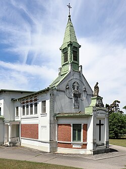 | Die Spitalskapelle des Landesklinikums in Mauer , ein Ortsteil der niederösterreichischen Stadtgemeinde Amstetten . Die Kapelle, ein repräsentativer Rechteckbau unter Flachdach, ist dem hl. Leopold geweiht. Sie bilde mit dem Festsaal, der westseitig direkt angebaut ist, eine Einheit. Die Heilanstalt selbst wurde als Pavillonanlage im Jugendstil mit rd. 40 Baulichkeiten ab 1898 nach Plänen von Carlo von Boog auf einem etwa 100 ha großem Areal errichtet, wobei ursprünglich eine Landwirtschaft, eine Gärtnerei und Werkstätten angeschlossen waren. Am 2. Juli 1902 erfolgte durch Kaiser Franz Josef I. die feierliche Eröffnung unter der Bezeichnung Kaiser-Franz-Joseph-Landes-, Heil- und Pflegeanstalt Mauer-Öhling ː 1 . | Eigenes Werk | C.Stadler/Bwag | Datei:Amstetten - Landesklinikum Mauer, Spitalskapelle (a).JPG | |