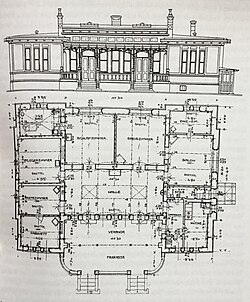 Ein repräsentativer Rechteckbau unter Flachdach mit einem ostseitigen Dachreiter. Die Westfassade wurde 1958 in reduzierten Formen erneuert.