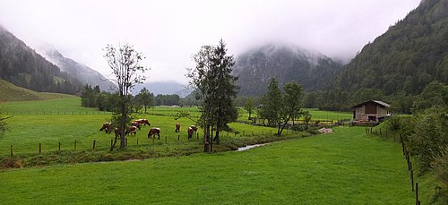 | Auenland am Seiwaldhof im Hagertal. Der Brunnbach windet sich durch den Almgrund (zwischen Kössen und Kirchdorf in Tirol). | Eigenes Werk | Notiro | Datei:Almwirtschaft im Landschaftsschutzgebiet.JPG | |
