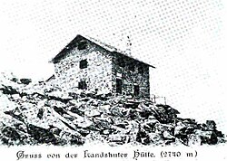 | Landshuter Hütte, alte Postkarte, etwa 1900 | Alberto Perini, Franz Gröll, Willi Scheithauer: Die Landshuter Europahütte/ Rifugio Europa Venna alla Gerla . Hrsg.: CAI Sterzing, DAV-Sektion Landshut. Artigraf, Sterzing 1989, S. 19 (italienisch, deutsch). | ? | Datei:Landshuter Hütte alt.jpg |
