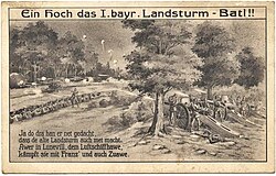 1. Bayerisches Landsturm-Bataillon, Weltkriegs-Erinnerungs-Postkarte, 1914 (eigener Scan von eigener alter Postkarte) | Eigenes Werk | Altera levatur | Datei:Bayerisches 1. Landsturm Bataillon Postkarte1.jpg | |