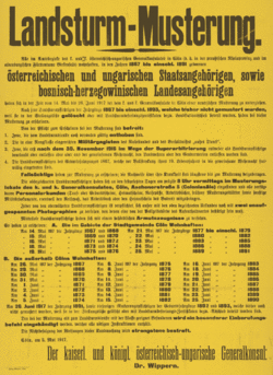 In Österreich-Ungarn war der Landsturm durch Gesetz vom 6. Juni 1886 geregelt. Danach unterlagen der Landsturmpflicht alle wehrtauglichen, nicht im aktiven Militärdienst stehenden Staatsbürger in zwei Aufgeboten (19.–37. und 38.–42. Lebensjahr) sowie darüber hinaus alle in den Ruhestand getretenen Offiziere und Militärbeamten bis zum 60. Lebensjahr.[5][6] Die Landsturmpflicht trat im Gegensatz zur regelmäßigen Kriegsdienstpflicht nur ausnahmsweise und zwar dann ein, wenn ein feindlicher Einfall Teile des Reichsgebiets bedrohte oder überzog. Der Landsturm erhielt bei Verwendung gegen den Feind militärische Abzeichen und trat dadurch unter völkerrechtlichen Schutz; er wurde wie die Armee in Truppenteile formiert. In Fällen außerordentlichen Bedarfs konnte die Landwehr aus dem Landsturm ergänzt werden, jedoch nur dann, wenn bereits sämtliche Jahrgänge der Landwehr und die verwendbaren Mannschaften der Ersatzreserve einberufen waren. Die Einstellung erfolgte nach Jahresklassen, beginnend mit der jüngsten. War der Landsturm nicht aufgeboten, so waren die Landsturmpflichtigen keinerlei militärischer Kontrolle unterworfen. In Österreich galt das Landsturmgesetz vom 6. Juni 1886 zwar formell nur für die im Reichsrat vertretenen Länder; die in Tirol und Vorarlberg (siehe Standschützen) sowie Ungarn geltenden Landsturmgesetze stimmten indes in allen wesentlichen Punkten mit dem vorgenannten Gesetz überein, desgleichen die Durchführungsverordnungen vom Januar 1887.