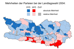 | Ergebnis der Landtagswahl in Kärnten 2004 nach Gemeinden (relative und absolute Mehrheiten der Parteien). | Diese Datei wurde von diesem Werk abgeleitet: Gemeinden Kärnten.svg data source: Die Landtagswahlen in Kärnten am 7. März 2004 (Hrsg.: Amt der Kärntner Landesregierung, Landesstelle für Statistik) | Furfur | Datei:Landtagswahlkarte Kärnten 2004.svg | |