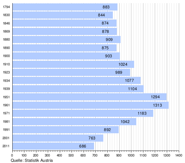 - ↑ Quellen: Bevölkerungsentwicklung 1869–2011 der Statistik Austria (PDF; 35 kB) und Historisches Ortslexikon Niederösterreich ( des vom 5. November 2010 im Internet Archive) Info: Der Archivlink wurde automatisch eingesetzt und noch nicht geprüft. Bitte prüfe Original- und Archivlink gemäß Anleitung und entferne dann diesen Hinweis. (PDF; 1,2 MB), Teil 2, S. 56.
