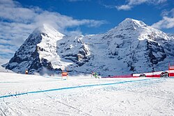 | Lauberhornabfahrt Wengen BE, Schweiz: Blick aus dem Starthaus auf Eiger, Mönch und Jungfrau | Veröffentlicht mit Genehmigung des Vereins Internationale Lauberhornrennen Wengen | Reto Nyffenegger im Auftrag des Vereins Internationale Lauberhornrennen Wengen | Datei:01 Lauberhornabfahrt 2019 5.jpg | |