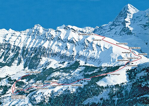 Die knapp 4500 m lange Strecke führt von der Südschulter des Lauberhorns hinunter in den südlich von Wengen gelegenen Weiler Schiltwald bei Innerwengen. Derzeit bewältigen die Sieger diese in einer Laufzeit von ca. 2:30 Minuten.