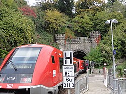 | Laufenburg (Baden) — Hochrheinbahn fährt in das Westportal des Rappenstein-Tunnels ein. | Eigenes Werk | User:Mattes | Datei:Laufenburg (1).JPG | |