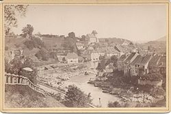 | Das linksrheinische Laufenburg (Baden) 1864, späterer Abzug handschriftlich auf der Rückseite 23. Juli 1881 datiert. Foto des Ateliers G. Th. Hase aus Freiburg im Breisgau (Vgl. Laufenburg - Bilder erzählen Geschichten, Binkert, Laufenburg, 2007. Dort auf Seite 6 irrig als älteste Fotoaufnahme Laufenburgs bezeichnet. Das Foto zeigt das rechtsrheinische Laufenburg vor den tiefgreifenden Veränderungen der folgenden Jahrzehnte vom Rheinblick aus aufgenommen. Hervorzuheben sind auf dieser Aufnahme die mittelalterliche 1882 abgebrochene Heiliggeist-Kirche, der 1910 gesprengte Laufen, die abgetragene rechtsrheinische überdachte Holzbrücke und der im Bau befindliche Vorgängerbau des "Schlössles" für den Basler Fabrikanten La Roche. | Selbstgefertigter Scan eines eigenen Fotos | Gottlieb Theodor Hase | Datei:Laufenburg (Baden) 1881.jpg |