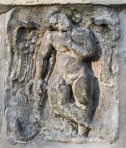 | Römischer geflügelter Todesgenius mit gesenkter Fackel aus dem 3. Jahrhundert an der Außenwand der Filialkirche St. Laurentius in Haag bei Markersdorf, Gemeinde Neulengbach , Niederösterreich | Eigenes Werk | Uoaei1 | Datei:Markersdorf Laurenzikirche Todesgenius 01.JPG |
