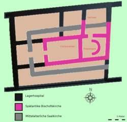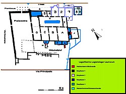 | Erhaltungszustand | quadratische Anlage mit abgestumpften Ecken und innen angesetzten Türmen, Rest des Grabens der NO-Ecke (Westbahntrasse) und Grundmauern eines Wohnhauses bei der Basilika St. Laurenz oberirdisch sichtbar |