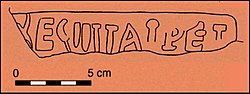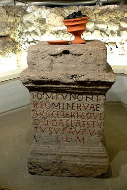 - ↑ AE 1968, 413: I(ovi) o(ptimo) m(aximo) Iunoni / reg(inae) Minervae / Aug(ustae) ceterisque / d(iis) d(eabusque) Q(uintus) Ael(ius) Restu/tus v(ir) p(erfectissimus) a(gens) v(ices) p(raesidis) v(otum) s(olvit) / l(aetus) l(ibens) m(erito). „Dem besten und größten Jupiter, der Königin Juno, der erhabenen Minerva sowie allen übrigen Göttern und Göttinnen gestiftet von dem hoch verehrten Aelius Restitutus, Statthalter der Provinz Noricum, der sein Gelübde freudig, gerne und nach Verdienst der Gottheiten eingelöst hat.“ S. Daten und Abbildungen bei Ubi erat Lupa.