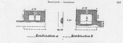 Im Jahre 1321 erfolgte die erste bekannte Entdeckung eines Inschriftensteins (Grabstein) durch den Mönch Berchthold aus Kremsmünster[15] während der Renovierung der Lorcher Basilika. Die Ruinen Lauriacums wurden danach beim Humanisten und bayerischen Hofhistoriographen Johannes Aventinus in seiner Bayerischen Chronik als „… große und mächtige Reichsstadt mit einer zwei Meilen großen Ringmauer.“ erwähnt. 1765 fand man unter anderem einen römischen Mosaikboden der aber wieder verloren ging. Im frühen 18. Jahrhundert werden die Mauerreste von einem durchreisenden Engländer, Richard Pococke, beschrieben.[A 2] Von Kremsmünster Pater Josef Gaisberger und P. Wieser wurden im Garten des Schlosses um 1851/52 erste Versuchsgrabungen unternommen, die zur Aufdeckung von „auf Säulen ruhenden Gewölben“ führten; es handelte sich hierbei um die Überreste eines Hypokaustums des Lagerbades. Die Gewölbe ruhten auf Säulen aus Granit, unter diesen befand sich ein Estrich aus zerstoßenen Ziegelbruch. Die Pfeiler wurden geborgen und anschließend fortgebracht. Aufsätze über diese Ausgrabungen hatte 1857–1861 Joseph von Arneth verfasst und im Jahre 1856 veröffentlicht. Viele Kleinfunde wanderten auch in die Taschen von Antikensammlern und gingen so der Wissenschaft für immer verloren, andere gelangen in private oder öffentliche Sammlungen und wurden später durch den 1892 gegründeten Museumsverein Lauriacum wieder zusammengeführt.