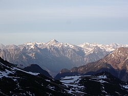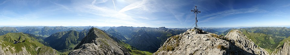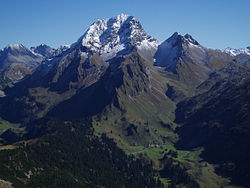 | Blick auf die Untere Wildgrubenspitze (links, 2.753 m), rechts daneben die Roggalspitze (2.673 m). Im Hintergrund sind die Pflunspitzen (2912 m) und die Östliche Eisentaler Spitze (2753 m). Zwischen diesen beiden in der Ferne der Große und Kleine Piz Buin. Rechts die Ronspitze (2498m). | Eigenes Werk ( Originaltext: self-made ) | Josef Saurwein | Datei:Lechquellengebirge1.jpg | |