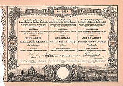 | Aktie der Lemberg-Czernowitz-Jassy-Eisenbahn | Scan von Aktie | Autor/-in unbekannt Unknown author | Datei:LCJE Aktie.jpg | |