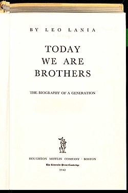 | Leo Lania: Today we are brothers : the biography of a generation . Übersetzung Ralph Marlowe. Boston : Houghton Mifflin, 1942 | Leo Lania: Today we are brothers : the biography of a generation . Boston : Houghton Mifflin, 1942 | Leo Lania | Datei:Leo Lania Today we are brothers 1942 Titel.jpg |