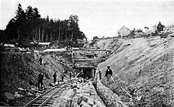 Trotz mehrfacher staatlicher Unterstützung[7][8][9] sah sich die Aktiengesellschaft k. k. priv. niederösterreichische Südwestbahnen,[10] die den Bahnbau begonnen hatte, unlösbaren Finanzierungsproblemen gegenüber, sodass der Staat die Restfinanzierung und schließlich 1878 die gesamte Bahnanlage[11] unter der Bezeichnung k. k. niederösterreichische Staatsbahnen übernahm.[10]