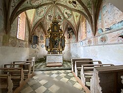Der mit Knorpelwerk dekorierte Altar von 1668 trägt eine Figur des heiligen Leonhard vom Anfang des 16. Jahrhunderts. Die ehemaligen Seitenfiguren des heiligen Christophorus und eines heiligen Bischofs mit einer Braun-Gold-Fassung wurden 1994/95 restauriert. Eine Votivtafel des 17. Jahrhunderts mit der Darstellung des heiligen Petrus und der Vierzehn Nothelfer wird mit dem Gurker Bischof Sigismund Franz in Verbindung gebracht.