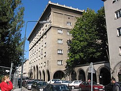 | Das Hauptgebäude der Österreichischen Nationalbank am Otto Wagner-Platz 3 im 9. Wiener Gemeindebezirk Alsergrund . Das Bauwerk war ursprünglich nach Plänen des Architekten Leopold Bauer ab 1912/13 als Druckereigebäude der Österreichisch-Ungarischen Bank und als Teil eines großen Bankgebäudekomplexes auf den Gründen der demolierten Alser-Kaserne errichtet worden. Wegen des 1. Weltkriegs und dessen Folgen wurde nur der Rohbau fertiggestellt. 1923 entschied die Österreichische Nationalbank, dieses Gebäude zum Hauptsitz des Instituts umzubauen und beauftragte dazu die Architekten Rudolf Eisler und Ferdinand Glaser. | Eigenes Werk | C.Stadler/Bwag | Datei:Alsergrund (Wien) - Hauptgebäude der Österreichischen Nationalbank.JPG | |