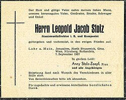 | Todesanzeige _Leopold Stolz | Arabelle Gleich, Enkelin v. Leopold Stolz | Margarete Stolz-Wreford, Tochter des Leopold Stolz | Datei:Leopold Stolz Todesanzeige 1957.jpg |