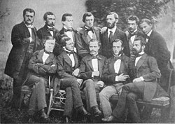 | Mitarbeiter von Robert Bunsen (* 30. März 1811 in Göttingen; † 16. August 1899 in Heidelberg), Mittagstischgemeinschaft in Heidelberg stehend, vlnr: Ernest Gaupillat (Paris), Sohn von François-André Gaupillat. - (Victor Ernest G.?, Victor Blaize G.? (*1834)) Agostino Frapolli (* 1824 in Mailand?; † 21. Februar 1903 in Mailand) 1 Adolph Wagner (* 25. März 1835 in Erlangen; † 8. November 1917 in Berlin) Henry Roscoe (* 7. Januar 1833 in London; † 18. Dezember 1915 in West Horsley) Lothar Meyer (* 19. August 1830 in Varel; † 11. April 1895 in Tübingen) Angelo Pavesi (* 11. Januar 1830 in Casalmaiocco; † April 1896 in Mailand?) 2 Friedrich Beilstein (* 5. Februar jul. / 17. Februar 1838 greg. in Sankt Petersburg; † 5. Oktober jul. / 18. Oktober 1906 greg. ebendort) sitzend, vlnr: Prof. Johann Friedrich Bahr (* 17. Juli 1815 in Wisby; † 8. Mai 1875 in Uppsala) Dr. habil. Hans Landolt (* 5. Dezember 1831 in Zürich; † 15. März 1910 in Deutsch-Wilmersdorf) Privatdozent Ludwig Carius (* 24. August 1829 in Barbis; † 24. April 1875 in Marburg) Privatdozent August Kekulé (* 7. September 1829 in Darmstadt; † 13. Juli 1896 in Bonn) Dr. habil. Leopold von Pebal (* 29. Dezember 1826 in Seckau; † 17. Februar 1887 in Graz) | http://s2w.hbz-nrw.de/ulbbn/content/pageview/999424 | Autor/-in unbekannt Unknown author | Datei:AK Bunsen-Heidelberg 1857.jpg | |