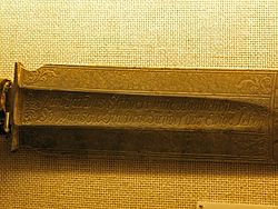 | Schwert (mit eingraviertem Sinnspruch) des Frankfurter Scharfrichters, der - zwischen 1484 und 1537 - damit seinen Beruf auch an der Berger Warte ausuebte. Im Heimatmuseum in Bergen-Enkheim. | Eigenes Werk | dontworry | Datei:Scharfrichterschwert-ffm002.jpg |