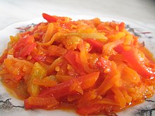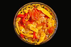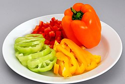 | Paprika in verschiedenen Formen geschnitten (rot: gewürfelt, grün: in Scheiben geschnitten, gelb: in Spalten geschnitten, orange: ganzer Paprika). Anlässlich des Treffens der Redaktion Essen und Trinken in Wien 2013. | Eigenes Werk | Bi-frie ( talk ) | Datei:13-08-31-wien-redaktionstreffen-EuT-by-Bi-frie-086.jpg | |