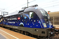 | ÖBB 1116 mit de:Licht ins Dunkel -Beklebung im Bahnhof Mödling vor einem Regionalzug | Eigenes Werk | Karl Gruber | Datei:ÖBB1116-LichtinsDunkel 0951.JPG |