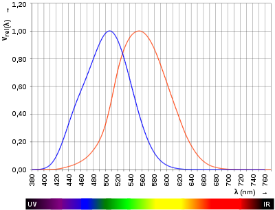| Hellempfindlichkeitskurve für photopisches und skotopisches Sehen blau = Nachtsehen (skotopisch), rot = Tagessehen (photopisch) | Eigenes Werk | HHahn | Datei:V-lambda-phot-scot.svg |