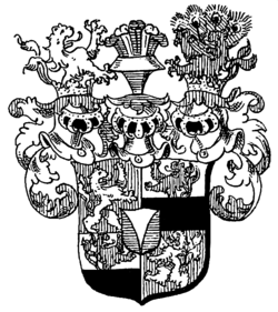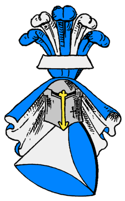 - Das Stammwappen zeigt in Blau eine gestürzte silberne Spitze. Auf dem Helm mit blau-silbernen Decken ein gestürzter, silbern aufgeschlagener Heidenhut, darin fünf abwechselnd blaue und silberne Straußenfedern.