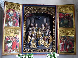 | Der Siebenhirteraltar oder Apostelaltar in der Kirche Lieseregg in der Gemeinde Seeboden in Kärnten / Österreich / Europäische Union . Gotischer Flügelaltar aus der Zeit um 1500 im südlichen Seitenschiff benannt nach dem Millstätter Hochmeister des Georg-Ritter-Ordenens Johann Siebenhirter († 1508), dem Stifter. Sowohl das Wappen des Georgsritterordens als auch jenes von Siebenhirter ist zu erkennen. Das Zentrum des Altars ist ein Schnitzrelief mit der Herabkunft des Hl. Geistes , wobei Maria im Kreise der zwölf Apostel sitzt. Die vier Flügelbilder stellen links oben den Marientod darunter den ungläubigen Thomas , rechts oben den zweifelnden Petrus beim Gang über das Wasser (Fischzug) sowie die Aussendung der Apostel dar. Die Gemälde werden einem unbekannten „Meister von Lieseregg“ zugeschrieben. Die Außenflügel enthalten Bilder der Apostel Petrus und Paulus, darunter die Evangelisten Lukas und Johannes . Einmalig in Kärnten ist die groteske Darstellung der Figuren. Während die Gesichter einheitlich, eher schmal in gleicher Größe dargestellt sind, entsprechen die körperlichen Proportionen und die Haltung nicht der natürlichen Anatomie. | Eigenes Werk | Joadl | Datei:Lieseregg 2009 05.JPG | |
