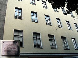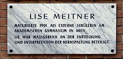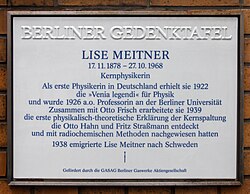 Lise Meitner (eigentlich Elise Meitner; geboren am 7. November oder 17. November 1878 in Wien, Österreich-Ungarn; gestorben am 27. Oktober 1968 in Cambridge, Vereinigtes Königreich) war eine österreichische Kernphysikerin und Pionierin der Radiochemie. Meitner zählt zu den bedeutendsten Naturwissenschaftlern des 20. Jahrhunderts.[1] 1906 wurde sie an der Universität Wien promoviert, als zweite Frau im Hauptfach Physik. 1907 begann in Berlin eine jahrzehntelange Zusammenarbeit mit dem Chemiker Otto Hahn. Ab 1912 arbeiteten Meitner und Hahn im neu gegründeten Kaiser-Wilhelm-Institut für Chemie in Berlin-Dahlem. Sie erforschten die Radioaktivität und entdeckten radioaktive Isotope. 1926 wurde Meitner die erste Professorin für Physik in Deutschland.