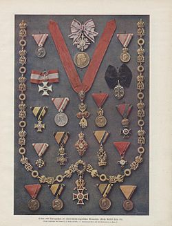 | Orden und Ehrenzeichen der österreichisch-ungarischen Monarchie, nach Originalen der Firma C. F. Rothe & Neffe , k..k. Kammerjuweliere und Hof-Goldarbeiter in Wien, I.. 1) Tapferkeitsmedaille 2) Elisabeth-Orden 3) Signum Laudis-Medaille 4)Viribus unitis-Medaille 5) militärische Maria Theresien-Orden 6) Sternkreuz-Orden 7) Militärdienstzeichen 8) Tapferkeitsmedaille 9) Jubiläums-Erinnerungsmedaille 10) St. Stephan-Orden 11) Ritterorden vom goldenen Vlies 12) Militär-Verdienstkreuz 13) Tapferkeitsmedaille 14) Franz Joseph-Orden 15) Orden der eisernen Krone 16) Goldenes Verdienstkreuz 17) Jubiläumsmedaille 18) Ehrenmedaille 19) Leopold-Orden 20) Kriegsmedaille 21) Feuerwehrmedaille | 1 | Österreichs Illustrierte Zeitung | Datei:Oesterreichs Illustrierte Zeitung Kaiser-Festnummer 1908-061.jpg |