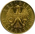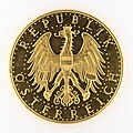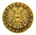 | 100 Schilling Goldmünze (1934) Österreichs . Nach einem Entwurf von dem aus Böhmen stammenden Bildhauer und Medailleur Arnold Hartig . In dieser Form wurde die Münze von 1926 bis 1934 mit einer Auflage von knapp 390.000 Stk. geprägt. Ab 1935 wird reversseitig ein Motiv mit starkem Österreichbezug und kirchlich-religiösen Inhalt gezeigt (Magna Mater Austriae, auch Mariazeller Madonna bezeichnet). Die Kennzeichnung Österreichs als Republik in der Legende entfällt und aversseitig wird das Wappen des Ständestaates ( Doppeladler ohne Hammer und Sichel) abgebildet. Durchmesser: 33,00 mm; Feinheit: 900/1000; Feingewicht: 21,17 g; Rauhgewicht: 23,523 g | Eigenes Werk | C.Stadler/Bwag | Datei:Österreich - 100 Schilling Münze, 1934, Revers.JPG | |
