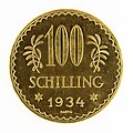 | 100 Schilling Goldmünze (1934) Österreichs . Nach einem Entwurf von dem aus Böhmen stammenden Bildhauer und Medailleur Arnold Hartig . In dieser Form wurde die Münze von 1926 bis 1934 mit einer Auflage von knapp 390.000 Stk. geprägt. Ab 1935 wird reversseitig ein Motiv mit starkem Österreichbezug und kirchlich-religiösen Inhalt gezeigt (Magna Mater Austriae, auch Mariazeller Madonna bezeichnet). Die Kennzeichnung Österreichs als Republik in der Legende entfällt und aversseitig wird das Wappen des Ständestaates ( Doppeladler ohne Hammer und Sichel) abgebildet. Durchmesser: 33,00 mm; Feinheit: 900/1000; Feingewicht: 21,17 g; Rauhgewicht: 23,523 g | Eigenes Werk | C.Stadler/Bwag | Datei:Österreich - 100 Schilling Münze, 1934, Avers.JPG | |