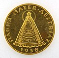 | 100 Schilling Goldmünze (1934) Österreichs . In dieser Form wurde die Münze von 1935 bis 1938 mit einer Auflage von knapp 18.000 Stk. geprägt, wobei der letzte Jahrgang großteils eingeschmolzen wurde. Im Gegensatz zu der 100 Schillingmünze, die von 1926 bis 1934 geprägt wurde, hat diese reversseitig ein Motiv mit starkem Österreichbezug sowie kirchlich-religiösen Inhalt und zwar die Magna Mater Austriae, auch Mariazeller Madonna bezeichnet. Die Kennzeichnung Österreichs als Republik entfiel in der Legende und aversseitig wird das Wappen des Ständestaates ( Doppeladler ) dargestellt. Durchmesser: 33,00 mm; Feinheit: 900/1000; Feingewicht: 21,17 g; Rauhgewicht: 23,523 g | Eigenes Werk | C.Stadler/Bwag | Datei:Österreich - 100 Schilling Münze, 1936, Revers.JPG | |
