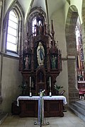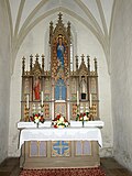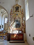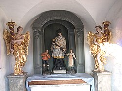 Auf dem Altar der Kapelle in der Pfarrkirche von Ernsthofen flankieren Darstellung der heiligen Aloisius und Johannes Nepomuks aus dem 19. Jahrhundert ein Relief einer Kreuzigungsgruppe. | |||