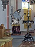 Auf dem linken Seitenaltar der Pfarrkirche von Amstetten steht eine neugotische Figur Johannes Nepomuks. | ||