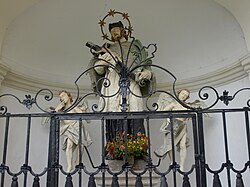Eine Statue des Heiligen aus dem 3. Viertel des 18. Jahrhunderts steht in einer Kapelle aus dem 20. Jahrhundert. | ||