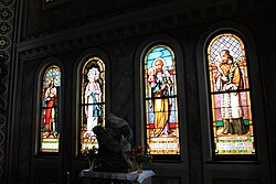 In der Klosterkirche der Schulschwestern befindet sich ein Glasfenster mit einer Darstellung Johannes Nepomuks. | ||