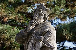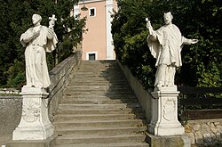 Unter den sechs Heiligendarstellungen an der Kirchenstiege von Wolkersdorf im Weinviertel befindet sich auch eine Statue Johannes Nepomuks. | |||