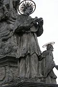 Auf dem Sockel der 1715 entstandenen Dreifaltigkeitssäule von Poysdorf befindet sich neben Statuen der Heiligen Rochus, Sebastian und Karl Borromäus eine Darstellung Johannes Nepomuks. | ||